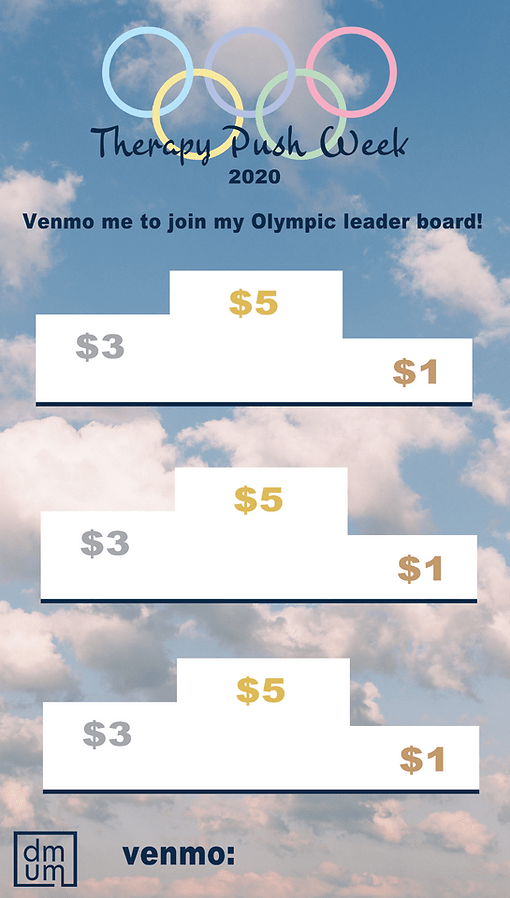 Another event sponsored by DMUM, Therapy Push Week is a week-long effort to highlight several pediatric rehabilitation therapies. I selected the Olympics as an exciting theme to get participants excited about learning and raising funds.