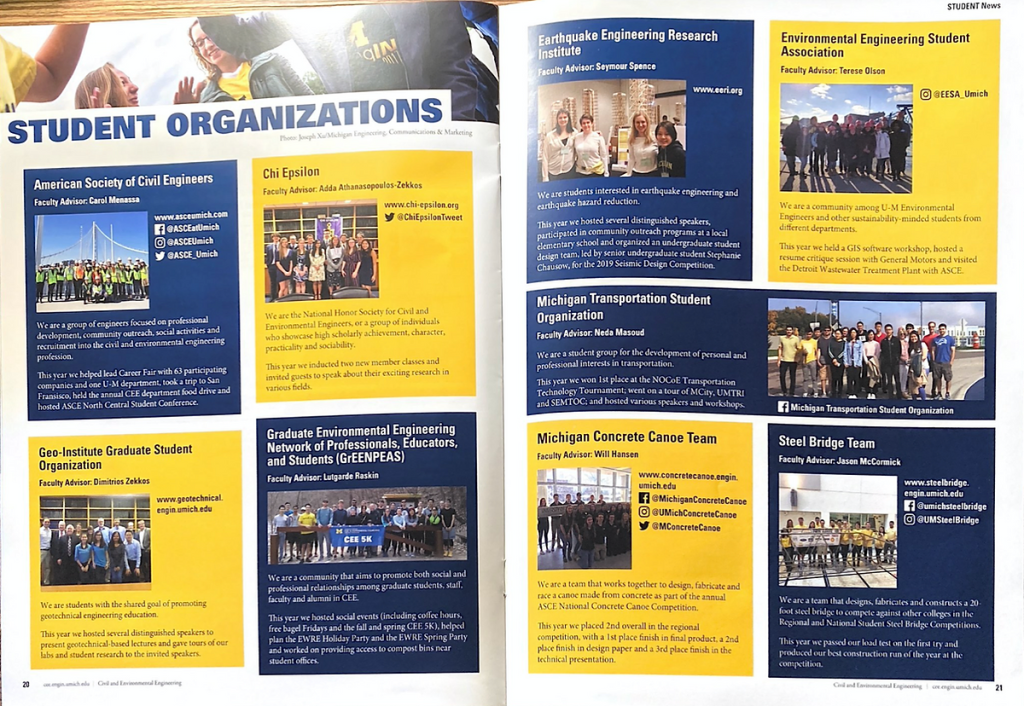 As a marketing communications intern at the University of Michigan’s Department of Civil and Environmental Engineering, I was given a variety of design tasks. Featured below are two: the student organizations page for the annual review magazine and social media graphics for the 2020 Borchardt Conference.
