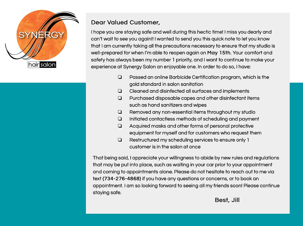 During the COVID-19 pandemic, I was employed by Synergy salon to develop a graphic template that could inform their clients on the sanitation measures that would be taken upon re-opening. The graphic is featured below, using salon brand guidelines and a simple design to reduce anxiety.