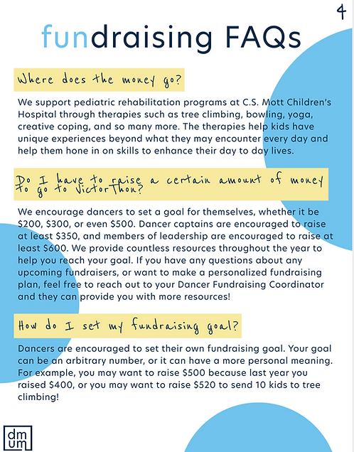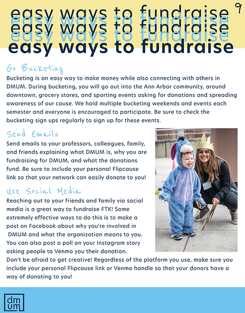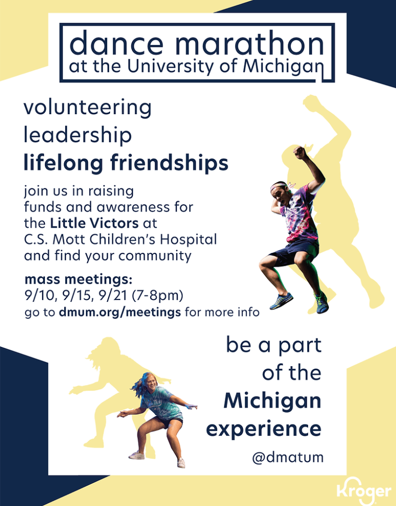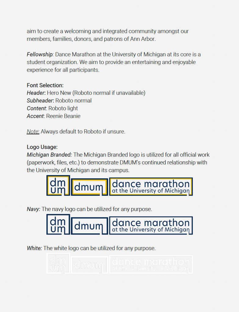 DMUM is the largest student-run nonprofit in the state of Michigan and raises funds for pediatric rehabilitation therapies. As marketing chair, I set my sights on rebranding the organization to properly channel the positive, childlike energy of the organization. I began with the logos, creating a 2 simple boxes that could be easily recolored and placed onto a variety of graphics. I selected navy and white for colors, as well as baby yellow and baby blue to act as the “children” of the University of Michigan’s classic maize and blue.